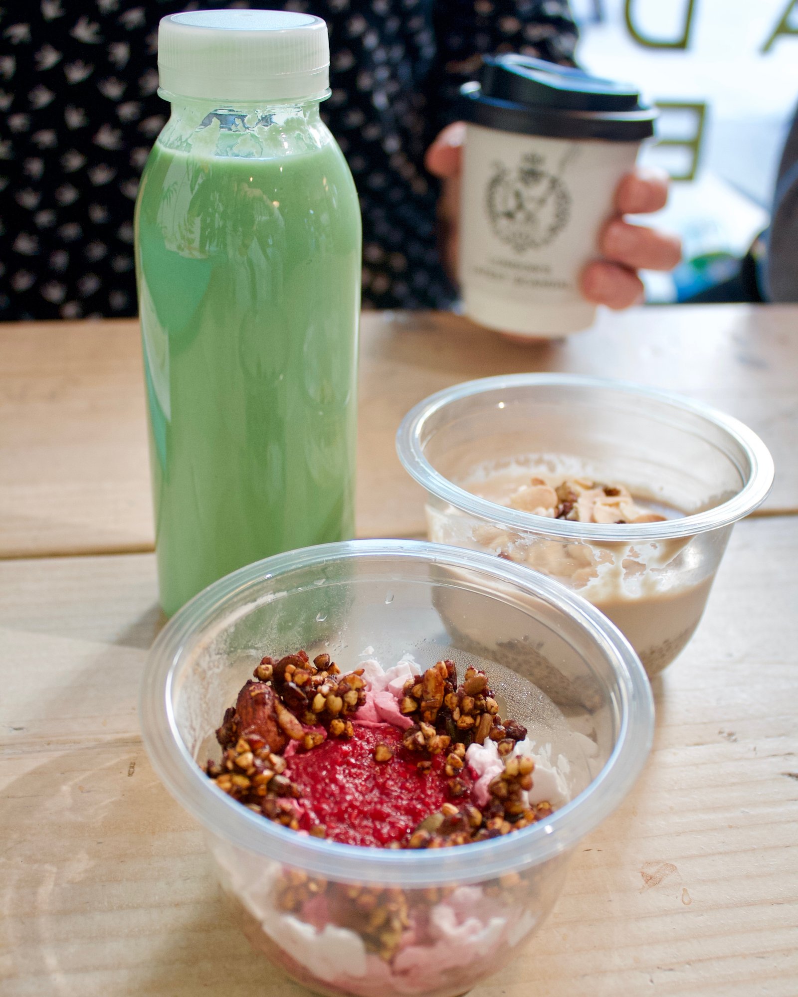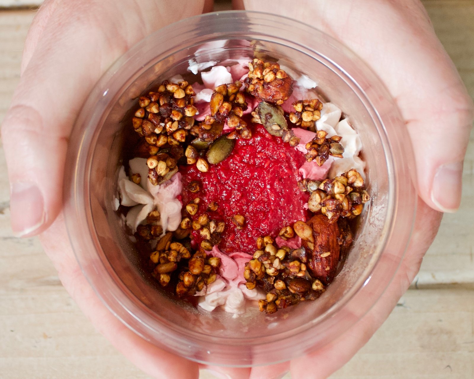 - For breakfast, I went for this Tropical Bircher breakfast pot, as I loved the summer vibes it gave off. The pot was sweet and creamy from the coconut cream and raspberry coulis, and the buckwheat granola on top added a wonderful crunch. The pot was on the small size, but it was a light and filling breakfast.