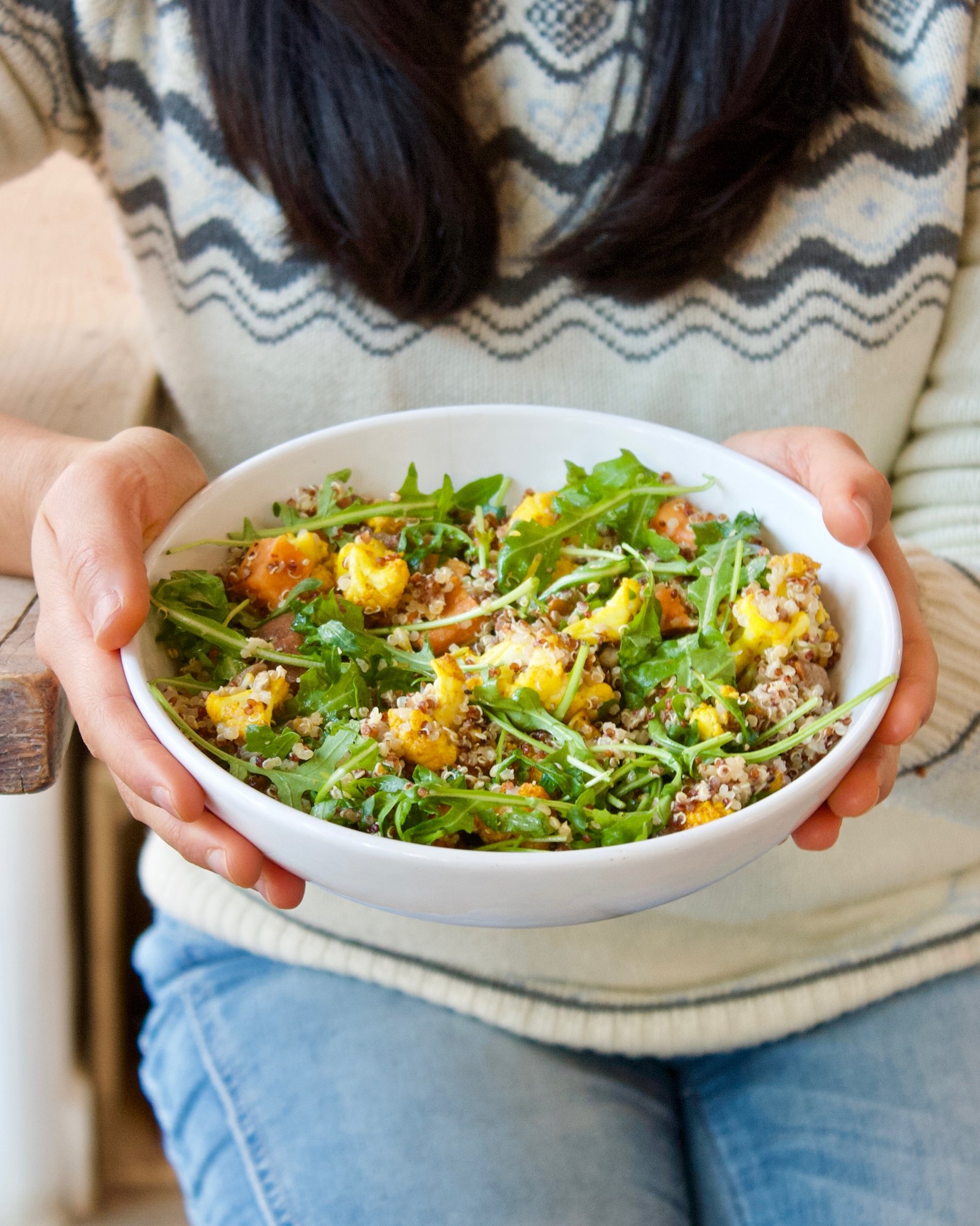 - There were several vegan and gluten-free salad options, but this one was my number one choice. I just loved the vibrant colours! There was a lovely mixture of tastes and textures from the miso dressing, baked sweet potato, turmeric cauliflower, and sunflower seeds.