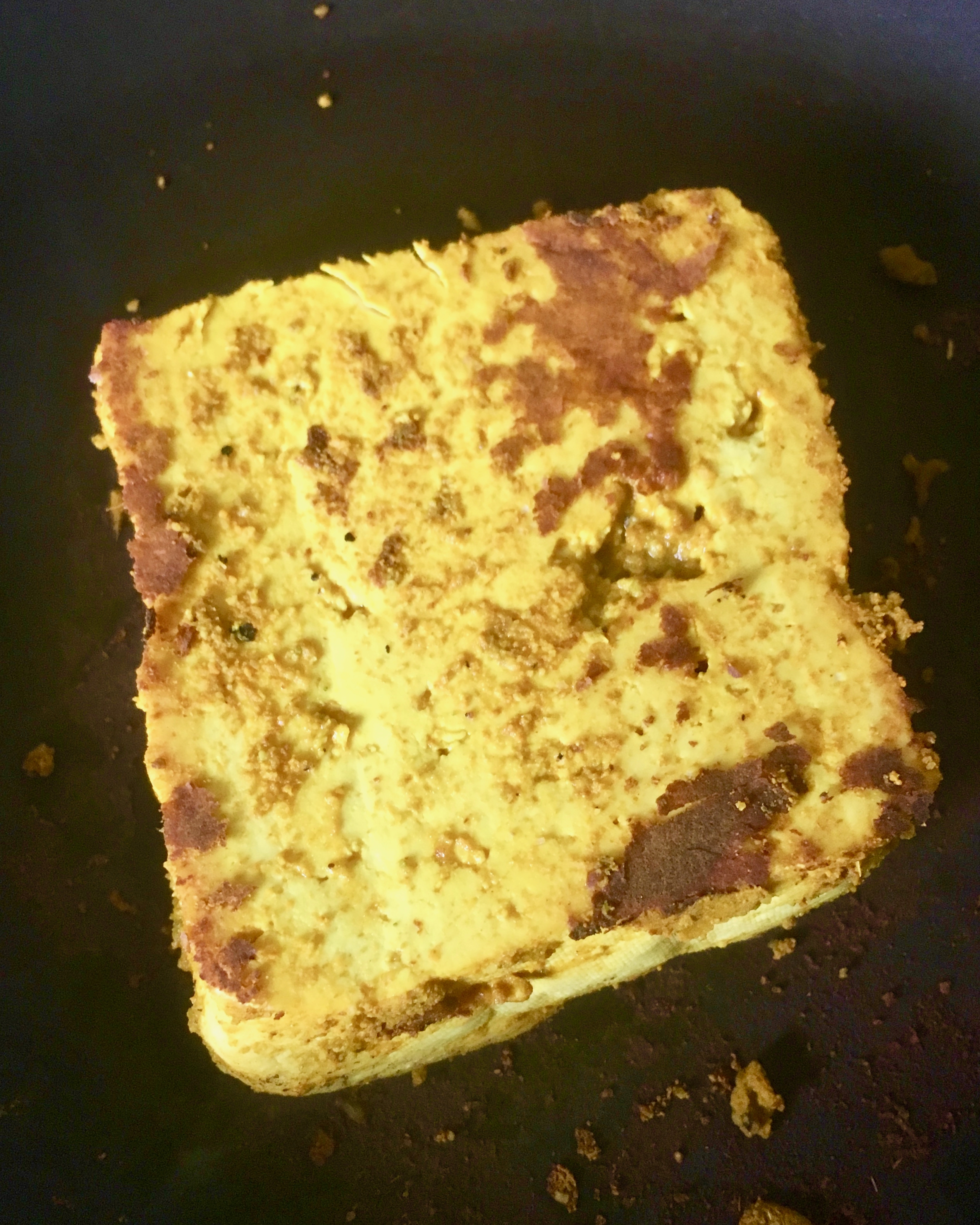 Heat up a pan and cook the tofu a few minutes on each side until lightly browned.