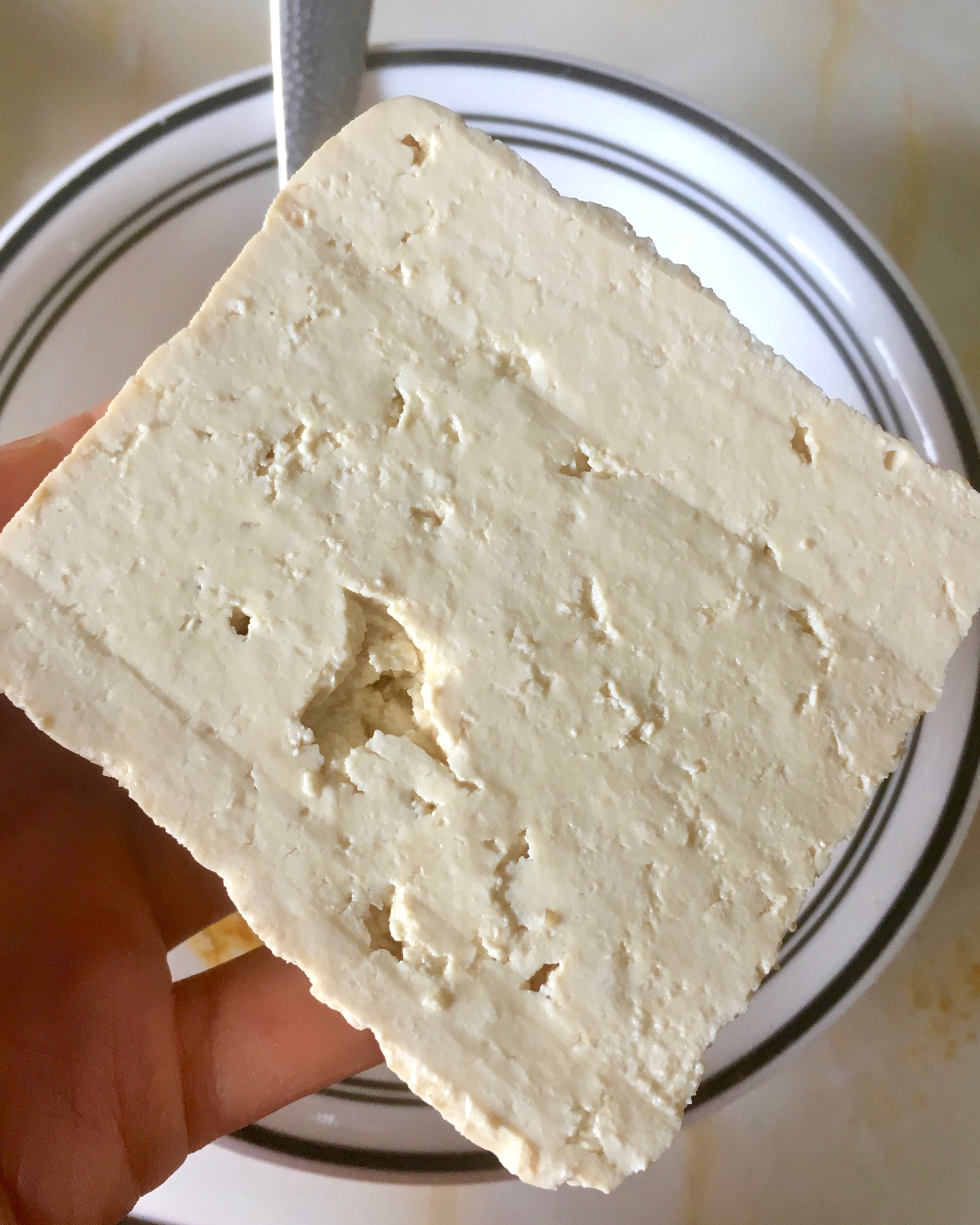 - 1/2 tofu cut into a square block I like @tofooco, but any firm/extra firm tofu will work