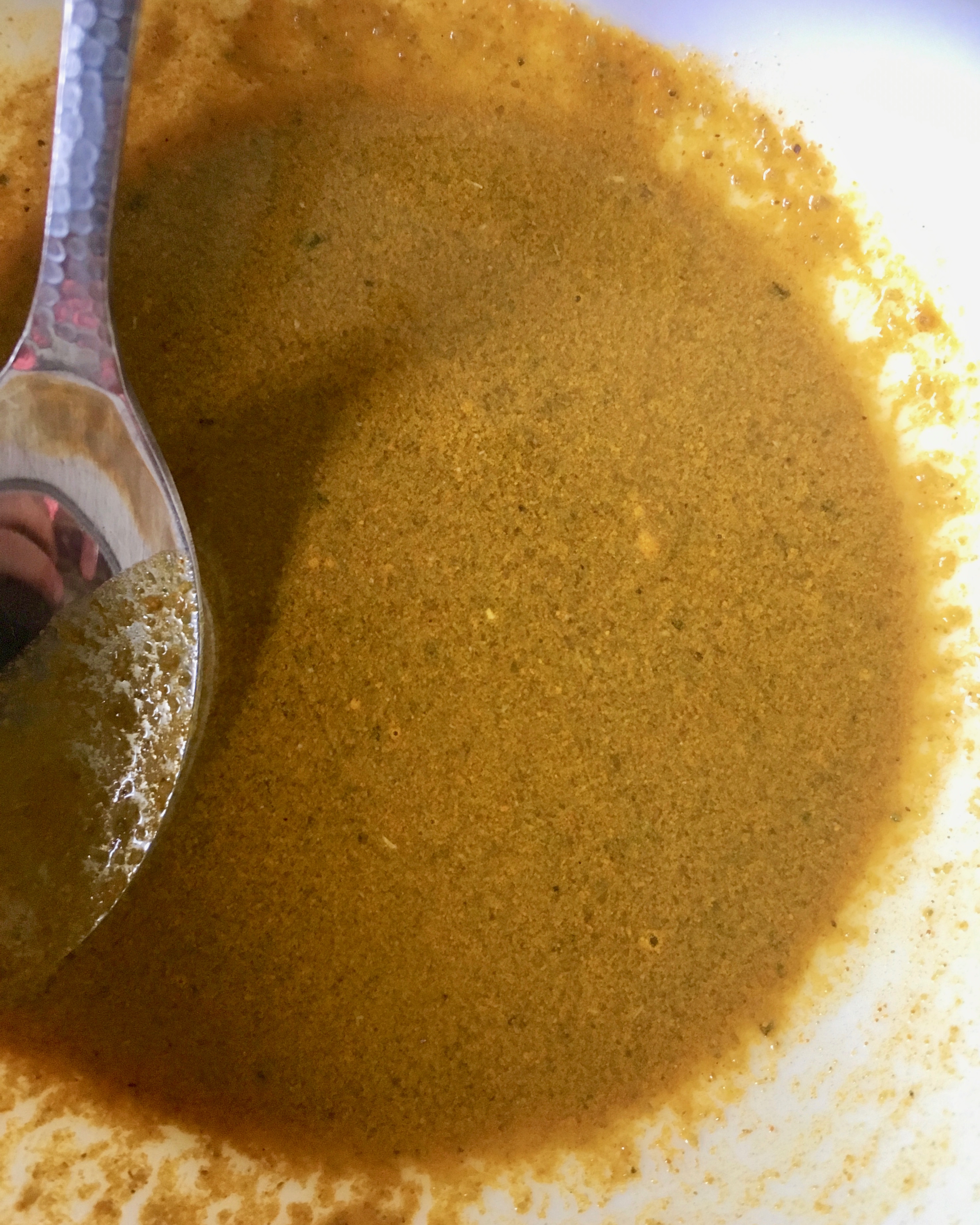 Mix the spices, salt, and pepper to create a sauce, and marinate the tofu block in the sauce for a few minutes.